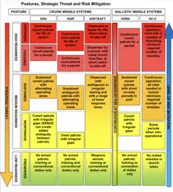 Gower's final professional naval post as Rear Admiral, in 2011-14, was to serve as Former Assistant Chief of Defence Staff (Nuclear, Chemical, Biological) in the United Kingdom Ministry of Defence.[8][9] In that role, Gower presided over the 2013 publication of the HM Government Trident Alternatives Review.[10] Having commanded nuclear-armed submarines, Gower was attentive to these weapons systems' role in the United Kingdom, as well as in NATO's strategic defenses. This report analyzes the role and credibility of nuclear deterrence and contrasts the effectiveness of various nuclear weapons systems.[10]: 4  Examining the topic of "credibility and constraints," the document puts forward clear statements about the nature of the UK's nuclear doctrine, deterrence credibility, extended and collective deterrence relevant to NATO, and legal constraints. The report delivers a detailed analysis of various nuclear warhead delivery platforms from large aircraft and submarines to mobile ballistic missile launchers.[10]: 16-17  It also compares different types of warheads from free fall bombs and cruise missile bombs to the UK Trident bomb.[10]: 19  It assesses several nuclear deterrence postures and credibility criteria, and considers the vulnerability of second strike forces. The Report concludes with a diagrammatic figure contrasting nuclear deterrence attributes of cruise and ballistic missiles, showing how as the perception of the threat of attack rises, the risks of attack are mitigated by increasing the readiness of deterrent forces.[10]: 58