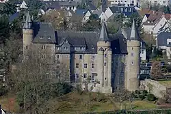 John sometimes had to endure attacks and abuse from his younger brother, Henry the Swashbuckler, who, even though he was a canon, nevertheless was a brutal fighter of his time, as the disconcerting epithet that his comrades gave him reveals.[7] Before 1389, John built Freudenberg Castle against the lords of Wildenburg and the counts of Sayn. He managed to put an end to the robber knights in his county.[2] In those lawless times, he decided to establish a vehmic court at Ginsburg Castle in the Siegerland. However, the establishment of a vehmic court was not allowed without imperial consent.[23] In 1384 John received it from Roman King Wenceslaus[2][7][23] when he visited him in Frankfurt. According to another charter of Wenceslaus from 1389, the seat of the vehmic court was to be at Ginsburg Castle and the judicial district of this court was to extend from the borders of the Westphalian lordship of Bilstein to the County of Sayn.[3][23] A charter of the same king from 1398 appoints Wynekin von Hilchenbach as a judge of the Ginsburg vehmic court, presumably after the court had been settled.[23] Perhaps, however, John soon realised his own mistake, or perhaps his sons later understood the abuses of this vehmic court; for it did not exist very long.[7] A century later John's great-grandson, Count John V, again established a vehmic court at Ginsburg Castle.[31]