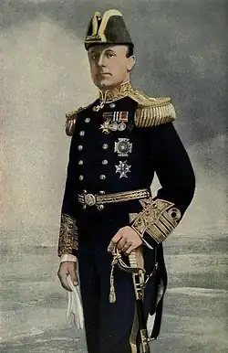 Jellicoe was appointed second-in-command of the Atlantic Fleet in August 1907, hoisting his flag in the battleship HMS Albemarle.[16] He was appointed Knight Commander of the Royal Victorian Order on the occasion of the King's Review of the Home Fleet in the Solent on 3 August 1907.[19] He went on to be Third Sea Lord and Controller of the Navy in October 1908 and, having taken part in the funeral of King Edward VII in May 1910,[20] he became Commander-in-Chief, Atlantic Fleet in December 1910, hoisting his flag in the battleship HMS Prince of Wales.[16] He advanced to Knight Commander of the Order of the Bath on the Coronation of King George V on 19 June 1911 and confirmed in the rank of vice admiral on 18 September 1911.[16] He went on to be Second-in-Command of the Home Fleet, hoisting his flag in the battleship HMS Hercules, in December 1911 and, having also been appointed commander of the 2nd Battle Squadron in May 1912, joined the Royal Commission on Fuel and Engines on 1 August 1912.[21] He became Second Sea Lord in December 1912.[16]