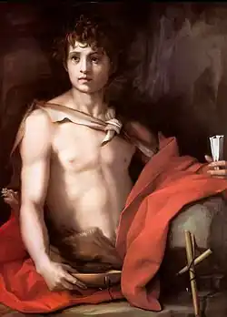 John the Baptist, Andrea del Sarto, 1528. Pitti Palace, Florence – a precedent for Caravaggio's treatment of the theme, with a similar use of background and symbols.