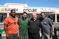 Jonathan Jackson, left in orange, during a cookout at his Cricket Wireless store on 55th St., Chicago