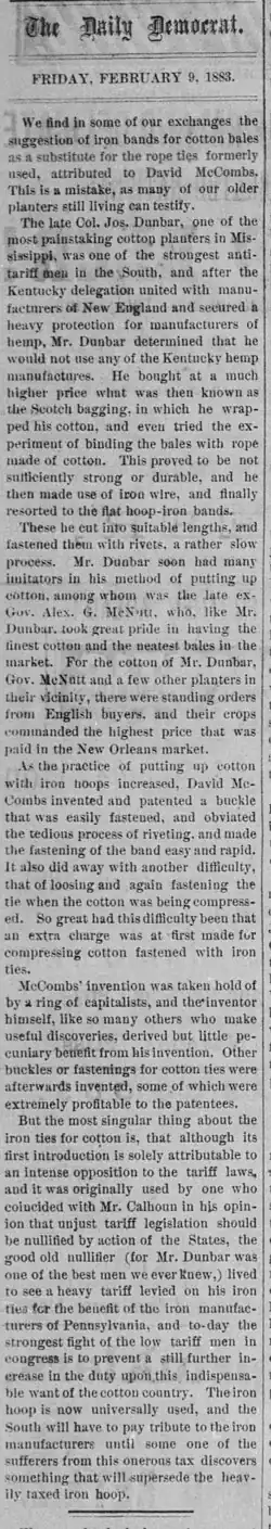 7. ^ a b "...the letter of the venerable Col. Jo. Dunbar, of Jefferson County..."". Port-Gibson Herald. September 28, 1843. p. 2. Retrieved 2025-04-27.