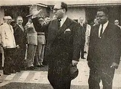 After Congo's independence from Belgium, his ABAKO party received 9.47% of the national vote for the Chamber of Deputies in the 1960 Belgian Congo general election, giving it a disappointing third place with 12 seats. In the Senate in the same election, ABAKO's result was even worse, receiving just over 5% of the vote and winning only 5 parliamentary seats. He forged an unlikely coalition between his regionalist and conservative ABAKO party and Patrice Lumumba's left-wing nationalist and election-winning Congolese National Movement (MNC) party, offering support in the government. In return, he received from the Lumumbists the indirect election of President of the Republic in the Senate and the National Assembly in 1960, defeating Jean Bolikango, his former political mentor.[12] The alliance between Kasa-Vubu and Lumumba was at least in part organized by Belgium, and his election as president was well received there. This was evidenced by the warm positive reaction of the Belgian press as well as of pro-Belgian Léopoldville periodicals such as the Courrier d'Afrique. The United States also expressed satisfaction at the election of a conservative to the Congolese government.[13] Belgian politicians expected Kasa-Vubu to act as a "restraining influence" on Lumumba's government, and failing that, that the Force Publique would always be able to "maintain law and order".[14] He was officially sworn in as president on 27 June 1960.[15]
