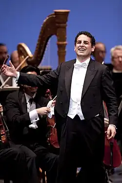 He was signed by Decca in 2001 and since then has released six solo recital CDs on the Decca label: Rossini Arias, which won the 2003 Cannes Classical Award; Una furtiva lagrima, which won the 2004 Cannes Classical Award; Great Tenor Arias which won the 2005 Echo Klassik award for the best arias and duets recital; Sentimiento Latino; Arias for Rubini, Bel Canto Spectacular and Gluck's Orphée et Eurydice, recorded live in May 2008.[10] In addition to his official discography, almost all his professionally performed roles have been preserved in radio broadcasts, and many also by television. He also sang the UEFA Champions League Final Anthem in Madrid at the Santiago Bernabeu in 2010.[11]