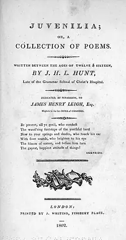 Juvenilia; or, a Collection of Poems Written between the ages of Twelve and Sixteen by J. H. L. Hunt, Late of the Grammar School of Christ's Hospital, commonly known as Juvenilia, was a collection of poems written by James Henry Leigh Hunt at a young age and published in March 1801. As an unknown author, Hunt's work was not accepted by any professional publishers, and his father Isaac Hunt instead entered into an agreement with the printer James Whiting to have the collection printed privately. The collection had over 800 subscribers, including important academics, politicians and lawyers, and even people from the United States. The critical and public response to Hunt's work was positive; by 1803 the collection had run into four volumes. The Monthly Mirror declared the collection to show "proofs of poetic genius, and literary ability",[1] and Edmund Blunden held that the collection acted as a predictor of Hunt's later success. Hunt himself came to despise the collection as "a heap of imitations, all but absolutely worthless",[2] but critics have argued that without this early success to bolster his confidence Hunt's later career could have been far less successful.