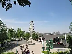 Located in the recreation area, the ferris wheel's height is 30 meters. It is 1,136 meters above sea level. There are 20 closed highly comfortable and safe cabins, 6 passengers for each cabin. There is great view on Almaty from cabins.[7]