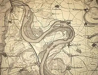 In 1828/29, directed by Großherzoglicher Darmstädter Wasserbaudirektor Claus Kröncke, a shortcut of the river (Rhein-Durchstich) shortened the passage for ships. The Kühkopf became an island with the new Rhine in the west and the former river bed (Altrhein). The former island Knoblochsaue became a peninsula.[5]