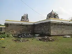 The temple has a flat gateway tower and all the shrines of the temple are enclosed in concentric rectangular granite walls. There is a sixteen pillar hall in front the gateway that has sculpted pillars dating back to the 16th century. The temple occupies an area of around 2 acres (0.81 ha). The temple tank is located adjacent to the sixteen pillared hall. The central shrine houses the image of Kachabeswarar in the form of Lingam. The shrine of Irulneeki Thayar (also called Anthaga Nivarini, facing West is located in the Mahamandapam leading to the sanctum. The central shrine is approached through the shrine of Thyagaraja located adjacent to the sanctum. As in other Shiva temples in Tamil Nadu, the shrines of Vinayaka, Murugan, Navagraha, Chandikesa and Durga are located around the precinct of the main shrine. There is a shrine depicting Shiva offering food to Sundarar on the Western side.[3] The sanctum is approached through a side entrance. The sanctum is in the form of a moat. The first precinct around the sanctum has the images of Vinayaka, Surya, various images of Nagalinga, Valli Deivanai, Subramanya, Nataraja, images of Nalvar. The shrine of Amman is a West facing shrine where the deity Anjanatchiamman is sported in standing posture.[1] The original complex is believed to have been built by Cholas, while the present masonry structure was built during the Nayak during the 16th century. In modern times, the temple is maintained and administered by the Hindu Religious and Charitable Endowments Department of the Government of Tamil Nadu.[4]