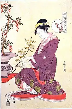 Woodcut ukiyo-e print by Eishi of a lady practicing ikebana