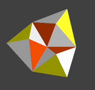 This animation demonstrates the flexing of a kaleidocycle around its ring axis. The four sets of 6 triangular faces are shown in different colours (with every other face in each set of six shown in grey for contrast).