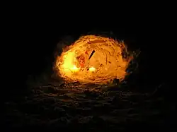 Much smaller in scale than the previous two festivals, the Narayama Kamakura Festival is held every February 12–15 in Narayama Otamachi, an area that is now part of central Akita City. Originally, this festival was held during the first full moon of the ancient lunar calendar, but now it falls regularly on the same date of the solar Gregorian calendar.[9] A makeshift Shinto shrine of snow with bamboo and straw roofing is erected for this festival each year and both Suijin and Kamakura Daimyojin are honored inside that shrine.[10] At one time, only males were allowed inside the shrine, but now those gender restrictions have been lifted. Empty rice bales are stacked inside the shrine of snow. Towards the end of the festival, one of those bales is lit during a special ceremony. Because a fire broke out during this festival in 1910, the ceremony was banned for sixty years. However, in 1975, the local neighborhood association revived this event, which now attracts many local residents and even some visitors from afar.[11]