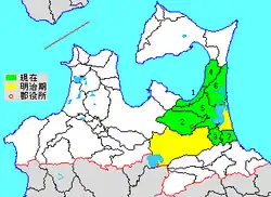 Location of Kamikita-gun, Aomori Prefecture, highlighted in green; with former areas in yellow.