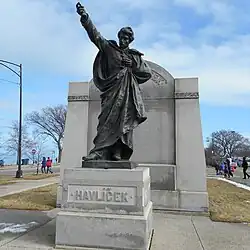 In 1911, a monument was raised to Havlíček in Chicago by Czech residents of the city in Douglass Park. The bronze statue by Joseph Strachovsky was cast by V. Mašek in Prague and shows Havlicek in a revolutionary pose, dressed in a full military uniform and a draped cape with his outstretched arm motioning the viewer to join him. The statue was moved to Solidarity Drive on today's Museum Campus in the vicinity of the Adler Planetarium in 1981.[3]