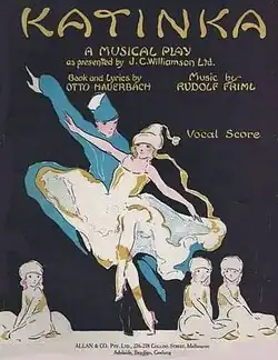 Katinka was first performed at the Park Theatre in Morristown, New Jersey on December 2, 1915 and subsequently moved to the 44th Street Theatre for its Broadway premiere on December 23, 1915.[2] The production starring May Naudain and Sam Ash as Katinka and Ivan was conducted by John McGhie and directed by Frank Smithson, with set design by Edward Sundquist and costume design by Paul Arlington. The show was an immediate success and ran on Broadway for 220 performances. It also had personal consequences for Friml, who began an affair with one of the chorus singers, Blanche Betters. The couple married in 1917 and divorced acrimoniously two years later, a fact which caused a New York judge to deny his 1921 request to become a naturalized US citizen.[3] Following its Broadway run, Katinka toured to several American cities including Los Angeles, Boston, Baltimore, St. Louis, and Atlanta and had regular revivals in the US until the late 1940s, as well as radio broadcasts. One of its rare 21st century revivals was in November 2009, when it was performed in concert version by the Comic Opera Guild of Ann Arbor, Michigan.[4]