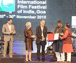 Ganguly (second from right) receiving the 'ICFT –UNESCO Award' for the film Cinemawala at IFFI 2015