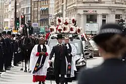 The following day, on 10 April, Palmer's coffin travelled in procession to Southwark Cathedral,[13] escorted by motorcycle outriders from the Special Escort Group of the Metropolitan Police. The route was 2.6 miles (4.2 km) long and avoided Westminster Bridge where the terrorist attack had begun.[14] Instead, the procession crossed the Thames over Lambeth Bridge, during which a ten-second horn salute was given by boats on the river.[13] Tens of thousands of people lined the streets, including 5,000 police officers.[13] The procession was fronted by a colour party carrying the Metropolitan Police Service Standard, who were followed by five mounted police officers.[14] Then came the funeral conductor and chaplains (including Rose Hudson-Wilkin, Chaplain to the Speaker of the House of Commons) who were walking in front of the hearse. The hearse carried Palmer's coffin which was draped in the police flag, and there were "red and white floral tributes atop the hearse"; these "spelled out 'No 1 Daddy', 'husband', 'son', 'brother', 'uncle' and 'Keith'".[14] Making up the rear were cars carrying his family, and four more mounted officers.[13]