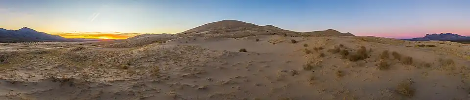 Kelso Dunes, also known as the Kelso Dune Field, is the largest field of aeolian sand deposits in the Mojave Desert. The region is protected by the Mojave National Preserve and is located near the town of Baker, San Bernardino County, California, and the Preserve Visitor Center.[2] The dune field covers 45 square miles (120 km2) and includes migrating dunes, vegetation-stabilized dunes, sand sheets, and sand ramps. The tallest dunes rise up to 650 feet (200 m) above the surrounding terrain.