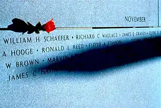 The Kentucky Vietnam Veterans Memorial is a memorial sculpture located in Frankfort, Kentucky, overlooking the state capital, and containing the names of 1,108 Kentuckians killed in the Vietnam War. The memorial is in the form of a sundial with the names placed so that the tip of the gnomon's shadow touches each man's name on the date of his death, thus giving each one his own personal memorial day.[1]