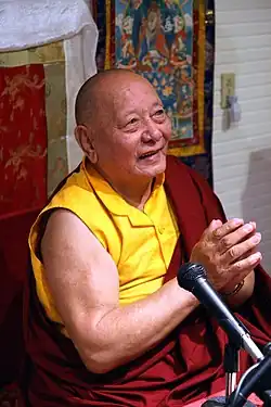 Khenpo Rinpoche lived until he was 95 years old (96 by Tibetan reckoning, which counts age from conception) and continued active teaching and his ministerial schedule to the end.[12] For example, over May 17–19, 2013 he transmitted the Khenpo Gangshar mind teachings ("Naturally Liberating Whatever You Meet," which he had received directly from Khenpo Gangshar)[13] and from July 13–21, 2013, he delivered the first-ever Spanish-language retreat and simultaneous webcast, attended in person by 60 Spanish-speaking pilgrims and across the internet by 1900 people from 39 countries.[14]