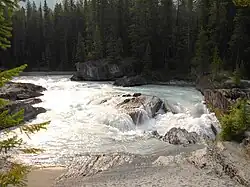 The Kicking Horse River is in the Canadian Rockies of southeastern British Columbia, Canada.[2] The river was named in 1858, when James Hector, a member of the Palliser Expedition, reported being kicked by his packhorse while exploring the river. Hector named the river and the associated pass as a result of the incident. The Kicking Horse Pass, which connects through the Rockies to the valley of the Bow River, was the route through the mountains subsequently taken by the Canadian Pacific Railway when it was constructed during the 1880s. The railway's Big Hill and associated Spiral Tunnels are in the Kicking Horse valley and were necessitated by the steep rate of descent of the river and its valley.