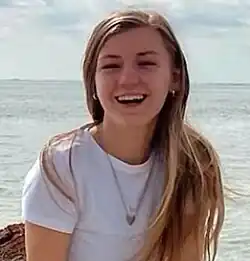 Gabrielle Venora Petito (March 19, 1999 – c. August 27, 2021) was born and raised in Blue Point, New York.[1] She had six younger siblings and half-siblings. In 2013, Petito and her step-brothers appeared in a music video to raise awareness about American gun violence in response to the Sandy Hook Elementary School shooting.[2][3] In 2017, she graduated from Bayport-Blue Point High School in Bayport, New York,[4] where she met Brian Christopher Laundrie.[5] From September 2017 to January 2019, she lived in Carolina Beach, North Carolina, working as a hostess and in the kitchen of a restaurant in nearby Wilmington. She applied to Cape Fear Community College, but did not attend.[6]