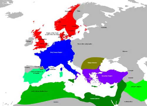 Map of Europe at the beginning of the novel. Shef's Empire of the North is denoted in red.