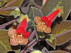 Kohleria is a New World genus of the flowering plant family Gesneriaceae. The plants are generally tropical herbs or subshrubs with velvety stems and foliage and brightly colored flowers with spots or markings in contrasting colors. They are rhizomatous and commonly include a period of dormancy in their growth cycle. The genus was revised in 1992 and was then recognized as having 19 species distributed in Central America and South America. phylogenetic in 2005 indicated that the epiphytic genus Capanea is derived from within Kohleria, and the two species of Capanea were subsequently transferred to Kohleria. The genus Pearcea is closely related.