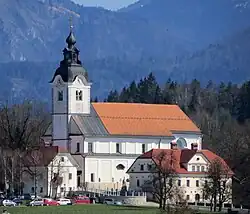 • The commandery of the Knights Hospitaller, also known as the Šmid Manor (Slovene: Šmidova graščina), is located immediately northwest of Saint Peter's Church. It is a two-story structure with four wings and an irregular interior courtyard. Its foundations date to the 13th century, and it was renovated in 1872 and again in 1909.[8] The Partisans burned it in 1944, setting a fire in each room, which destroyed all of the furnishings and badly damaged the frescoes and Gothic stonework.[9]