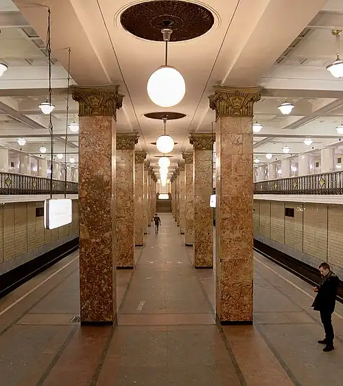 Due to Komsomolskaya's location under a major transit hub, the station was built with an unusual upper gallery above the platform to help handle rush crowds. The station has tall pillars faced with pinkish limestone and topped with bronze capitals displaying the emblem of the Komsomol league. The station was designed by Dmitry Chechulin, and a model of it was displayed at the 1937 Paris World's fair.