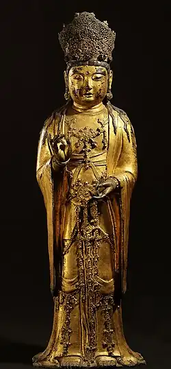 Images of the Buddha were probably first imported by monks sent from China and the Buddhist sculpture of Korea is indebted to prototypes developed in India, Central Asia, and China. From these influences, a distinctive Korean style formed.[2][3] Korean Buddhas typically exhibit Korean facial characteristics, were made with native casting and carving techniques, and employed only some of the motifs that were developed earlier in Buddhist art.[1] Additionally, Korean artisans fused together different styles from different regions with their own tastes to form a native art tradition.[4] Korean art is too often incorrectly described in Western literature as merely a passive bridge transmitting Chinese art to Japan. One area of Korean art where this is decidedly not the case is in Korean Buddhist sculpture. Korean stylistic developments and forms were greatly influential in the Asuka, Hakuhō, and Tenpyo periods of Japanese Buddhist sculpture when Korea transmitted Buddhism to Japan in the 6th century.[1][5][6]