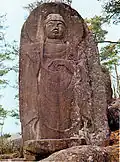 The Eunjin Mireuk is example of early Goryeo sculpture demonstrating the rise of regional styles and the abandoning of a strict interpretation of the standard iconography of Buddhist images.[47] The statue is believed to be a representation of the Avalokitesvara Bodhisattva, the Bodhisattva of Mercy, although it is popularly known as Maitreya. The statue is over 18 meters tall and took over 30 years to complete.[48][49] The statue is valuable because it demonstrates developments unique to Chungcheong-do and Gyeonggi-do.[48] Additionally, some scholars posit that these huge stones may have once been originally for Shamanistic practices and later subsumed into a Buddhist image.