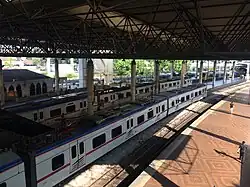 KTM Komuter Class 92 and Class 83 trains waiting at the newer wing of Kuala Lumpur station, built during the 1986 refurbishment.
