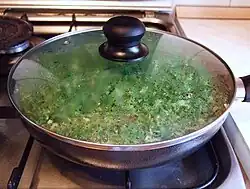 The traditional preparation of kuku involves frying the ingredients in oil over a low heat and is accomplished with steaming in a closed space.[10] Baking is also a popular method of preparation. An extra thickness is given to the dish by adding yeast.[6] The ultimate result is a cake-like omelette that is usually served with bread, but it might rather be accompanied by rice, particularly in the northern Iranian province of Gilan, where the consumption of rice in general was traditionally preferred over bread.[6]