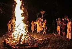 A number of activities and rituals are associated with Kupala Night, such as gathering herbs and flowers and decorating people, animals, and houses with them; entering water, bathing, or dousing with water and sending garlands on water; lighting fires, dancing, singing, and jumping over fire; and hunting witches and scaring them away. It was also believed that on this day the sun plays and other wonders of nature happen.[1] The celebrations are held near the water, on the hills, surrounding that; chiefly, young men and women participate in these folkloric traditions.[2] The rituals and symbolism of the holiday may point to its pre-Christian origins.
