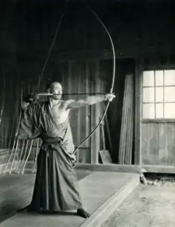 Kyūdō (Japanese: 弓道) is the Japanese martial art of archery. Kyūdō is based on kyūjutsu ("art of archery"), which originated with the samurai class of feudal Japan.[1] In 1919, the name of kyūjutsu was officially changed to kyūdō, and following the example of other martial arts that have been systematizing for educational purposes, kyūdō also reorganized and integrated various forms of shooting that had been used up until then.[2] Many practitioners may refer to themselves as yumihiki (弓引き), or 'ones who draw the bow'. Kyūdō is practised by over a hundred thousand people worldwide. The bow they use is called a yumi (). It has an asymmetrical shape and length of more than 2.0 metres (6 ft 7 in), and its use is characterized by the archer gripping the lower third of the bow stave to shoot.[3][4]