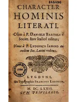 Louis Janin, S.J. (1590–1672) began as a teacher of classical style in France and spent 15 years in Rome as Latin secretary for the French Assistancy at Jesuit headquarters before he returned to Lyons. There he diligently translated five large volumes of Bartoli's Italian Istoria della Compagnia di Gesu between 1665 and 1671. His Latin version of the L'huomo di lettere appeared in Lyons in 1672.[15] A second printing appeared in Cologne in 1674 "opusculum docentibus atque ac discentibus utile ac necessarium".[16] In 1704 this Latin translation was partially reprinted by the Jesuit Faculty of Theology at University of Wroclaw (Breslau), recently founded by Leopold I, Holy Roman Emperor. It was issued in honor of its first graduates, four new doctors of theology.[17] To Janin's version was added a second translation into Latin by the Lutheran pastor in the service of Frederick I of Prussia in Prussian Kűstrin, Johann Georg Hoffmann, (1648–1719) Homo literatus defensus et emendatus. It was printed in nearby Frankfurt an der Oder in 1693.[18] His translation was published by Jeremias Schrey[19] The text contains an excellent system of embedded biblical references.[20] Hoffman became a doctor of Sacred Scripture in 1696.