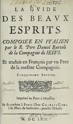 The French translation was first to appear in 1651. It was done by the Jesuit writer Thomas LeBlanc, (1599–1669) upon his return from Italy where the book had made Bartoli famous for his eloquence and erudition. LeBlanc was author of a five-volume commentary on the Psalms of David in Latin and of several pastoral works in French.[5] It first appeared as L'Homme de lettres (Pont-a-Mousson). In 1654 it was reprinted under the more galant title, La Guide des Beaux Esprits and as such went through several editions. The fifth printing of 1669 was dedicated to Charles Le Jay, Baron de Tilly, from the ascendant noblesse de robe, influential supporters of the Society of Jesus and its colleges.[6] Timothée Hureau de Livoy (1715–1777), a Barnabite priest and lexicographer was the translator of Denina and Muratori. In 1769 his Bartoli translation appeared with critical notes L'Homme de lettres, ouvrage traduit de l'italien augmenté de Notes historiques et critiques[7]