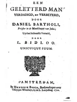 Amsterdam's enterprising and productive man of letters, Lambert Bidloo (1638–1724) was, like the Ferrarese Bartoli's father, Tiburzio, an apothecary by profession. As a man of letters he wrote scientific and poetic works in Latin, as well as in Dutch. Bidloo became an active member of Amsterdam's Mennonite community when it split in two (1664). His Dutch prose works are concerned mostly with defending the more conservative views of his church, called the "Zonists" and led by Samuel Apostool against the more liberal "Lamist" Mennonites led by Galenus Abramsz de Hann. From his youth on he wrote pamphlets against the laxity of his Lamist opponents, tainted with Socinianism. In his old age he set to the challenge of translating Bartoli. His rendering of the Italian work has a beautiful frontispiece engraving (perhaps by the young and talented Jacobus Houbraken). The title page proposes the defense and bettering of Bartoli's "lettered" man. Even after Bidloo's death in 1724 Hendrik Bosch, his Amsterdam printer, likely a fellow Mennonite, would continue publishing the works of the learned chemist. The preface of his translation begins with a dedication to his daughter Maria, his faithful "bibliothecaria". He goes on to recall his first introduction to Bartoli's opuscula as a literary nec plus ultra through his acquaintance with Aloysius Bevilacqua who arrived in the Netherlands to represent pope Innocent XI as nuncio at the Congress of Nijmegen (1677/78), seeking peace for the United Provinces against the invading Louis XIV. As was the custom, the book is decorated with a garland of laudatory poems by noted literary contemporaries, Pieter Langendijk, Jan van Hoogstraten. Matthaeus Brouwerius, et al. Bidloo provides the section headings of the treatise with chapter numbers. Part I, 1–11; Part II, 1-27.[22]