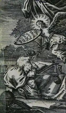 In Nürnberg in 1654 a German version appeared anonymously under the title, Vertheidigung der Kunstliebenden und Gelehrten anstandigere Sitten, The translator, Count Georg Adam von Kuefstein (1605–1656) in his preface signs himself Der Kunstliebende, his moniker as a member of the prestigious language academy, the Fruitbearing Society (Fruchtbringende Gesellschaft) under whose name and auspices the book was issued.[8] There is a frontispiece title engraving with a shielded angel "ratio" defending "Vertheidigung" the writer "eruditio". Underneath the book on the writing table there is a scroll which surreptitiously spells out the author's name as "D. BAR/TOLI". After the title page come the translator's preface and 11 poetical compositions by other Gesellschaft members including the Nurenberger Georg Philipp Harsdörffer, Der Spielende, Sigmund von Birken who oversaw the preparation of the book, Wolf Heimhardt von Hohberg Der Sinnreiche, Cambyse Bianchi del Piano, Der Seltene, from Bologna, who collaborated with Kufstein on the translation, Johan Wilhelm von Stuhlenberg, Der Ungluckselige, Erasmus der Junger von Strahlemberg, Der Liedende, Christoff Dietrick von Schallenberg, Der Schallende and Harsdörffer's son, Carl Gottfried. These poetic exercises, including a pastoral dialogue, introduce the themes of Bartoli's text. Bartoli's numerous Latin quotations are given here in German, directly along with the citations in the margin.[9] At the end there is an index for subjects and one for persons and finally a helpful list of the classical authorities with page numbers.[10]