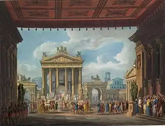 The opera premiered to great success on 19 November 1825. Nicolini's production was an expensive extravaganza involving numerous changes of sets, complex lighting, and the use of real explosives. The spectacular climax depicting the fiery eruption of Mount Vesuvius was accompanied by a simulated earthquake and lightning as nine gauze curtains painted with clouds of ash and fire were raised one after the other to reveal the volcano.[1] According to a contemporary account, when molten lava appeared to flow towards the front of the stage, the effect was so realistic that people in the stalls were terrified. The set designs for the Naples premiere have been lost. However, multiple copies of Alessandro Sanquirico's designs for the 1827 La Scala production have been preserved. Kenneth Lapitan, a curator at the J. Paul Getty Museum, has proposed that Sanquirico's designs probably followed Nicolini's production quite closely.[1]