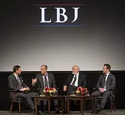 (L–R) Mark Updegrove (LBJ Library Director), Woody Harrelson, Rob Reiner and Joey Hartstone participate in a discussion following a screening of LBJ at the LBJ Presidential Library