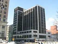 Buildings flanking the square include the Liberty Building,[11][12] the Main Court Building,[12] 10 Lafayette Square,[12][13] the Rand Building (14 Lafayette Square),[12][13] and the Buffalo & Erie County Public Library (One Lafayette Square).[12] The south side of the square hosts two historic buildings: the 300-room Lafayette Hotel, designed by Louise Blanchard Bethune in 1904; and the Brisbane building, designed by Milton Earl Beebe and erected by James Mooney and James Brisbane in 1894–5. The corner north of the current library and northeast of the square once hosted the Buffalo Savings Bank building that was demolished in 1922.[14]
