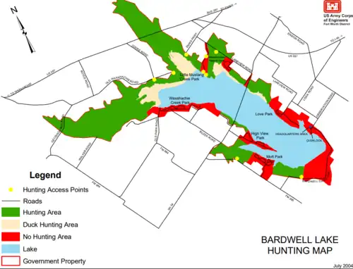 The hunting program for Lake Bardwell is managed by the Fort Worth District of the U.S. Army Corps of Engineers, who work with Texas Parks and Wildlife Department and several other entities to provide hunting opportunities.[28]