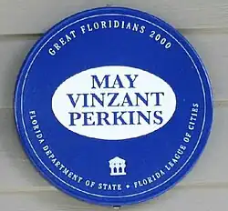 Vinzant's youngest daughter May was married to Herbert Perkins and the couple moved to Jacksonville, Florida. In 1912 she birthed a son who died after one day. Ten years later she left Jacksonville, returning alone to her mother's home in Lake City. She began writing poetry and historical accounts of family, friends and neighbors in Columbia County. Her mother Mattie died in 1926 and Perkins became a prominent member of the Lake City Garden Club and the Lake City Woman's Club. She edited the society column in the Lake City Reporter for decades.[8] Perkins authored a popular article about Aunt Aggie's Bone Yard, a historic garden in Columbia County. Her compositions were regularly published in the Florida Times Union.[8] Perkins was a notable Lake City poet and historian. Her verse, The Immutable Bond was judged Florida Women's Club Poem of the Year in 1943. The poem, Renaissance appeared in the quarterly issue of the Avalon National Poetry Shrine, The Raven.[8] She lived alone in the house until shortly before her death in 1981 at 102 years old.[9] Since the death of Perkins the house is still called the May Vinzant Perkins house. In 2000 May Vinzant Perkins was named a Great Floridian 2000, which honors individuals who made significant contributions to the history and culture of Florida.[8] A plaque was placed on the front of the house commemorating the fact.[10][11]