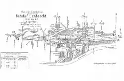 On 24 December 1881, Palatine Ludwig Railway Company (Pfälzische Ludwigsbahn-Gesellschaft) established a yard for loading timber near the station in order to improve operations.[50] This later developed into Lambrecht freight yard, since Lambrecht station had reached the limits of its capacities and, for reasons of topography, an extension of the track layout was impossible.[51] Frankeneck freight yard was also built at the other end of the track that developed into the Little Cuckoo Railway.[52] In order to get to the freight yard, the trains had to reverse in Frankeneck station, with the locomotive running around the train. The freight yard itself had four main tracks.[53]