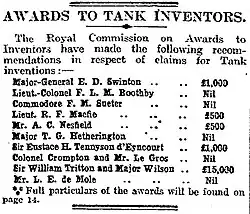 - Awards to Tank Inventors, The (Adelaide) Register, (Thursday, 29 January 1920), p.6.