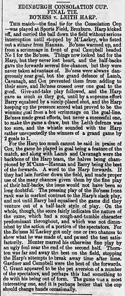 Despite the club staying outside the Scottish Football Association, the Harp proved to be a tough side. Although it could not get past the senior sides in the Edinburgh Shield, it had success in the Consolation Cup, for clubs eliminated before the final. In 1885–86, the Harp was so strong that it beat Pumpherston 5–0 despite playing the match with ten men;[3] the club reached the semi-final, and held the eventual winners Bo'ness to a draw.[4] The replay went to extra-time before Bo'ness won through 4–1.[5] The club at least had consolation by lifting the Leith Cup, goals from M'Bride, M'Parland, Boyle, and Smith seeing the club past Leith Thistle.[6]