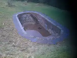 The spring was discovered in 1793 while digging was being carried out at this section of the Royal Canal. The water from the spring was diverted to a hexagonal basin beside the canal. A bucket was added to the construction so that visitors could draw a bucket of spring water from the canal tow path without descending from their carriages.[5] A channel was constructed from the basin to an elongated oval stone well chamber with steps descending to the interior at either end. This was known as the Roman Bath or Romanesque Bath. This construction was approximately 0.7 m deep. Water entered the Bath from a single point at one end. The Bath gave views of the Rye Water waterfall (canal overflow) and aqueduct 100 feet below it at the time. Between the Roman Bath and the River Rye are a series of terraces, down which seepage from the springs flows.