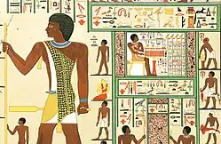As early as the Old Kingdom, the tomb owner is often depicted wearing a leopard skin cloak on false doors and the entrance areas of burial chambers. This is supplemented by ritual acts in connection with the display of livestock and the provision of offerings. In the cult of the dead, the leopard skin does not represent an earthly office, but shows the ideal rank of the grave owner, which is achieved with the completion of the burial and, as the wearer of the leopard skin, enables him to live on in the sacred land of the deceased with magical powers.[17] In the Middle Kingdom, further functions of the leopard skin are added with the practice of the cult of the dead. It was also part of the standard equipment of those involved in the area of mortuary sacrifices; usually the eldest son or the Shem priests, who were elevated to the rank of sorcerer and thus received the status of "divinely endowed and recognized spirits of the dead".[18] Tomb reliefs and stelae show the newly added ritual costume alongside the tomb owner in the traditional role. With the beginning of the New Kingdom, the depictions of the leopard skin predominate on account of its connection to the priestly cult of the dead as the "loving son" and "first of the sacrificial cortege". In the opening of the mouth ceremony, however, the leopard skin retained its central effect as a cult object of the deceased.[19]
