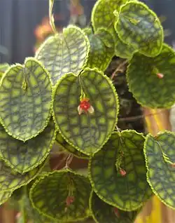 Lepanthes calodictyon is a small epiphytic orchid native to the montane forest of Ecuador and Colombia, commonly found at elevations ranging from 450 to 1,500 metres (1,480 to 4,920 ft).[1][2] This orchid practices pseudocopulation, with the flower resembling a female insect to the extent of initially fooling entomologists) the flower grows out of the leaf. The leaves have a checkerboard pattern of two shades of green on the upper surface, and red stripes on white underneath.[3]